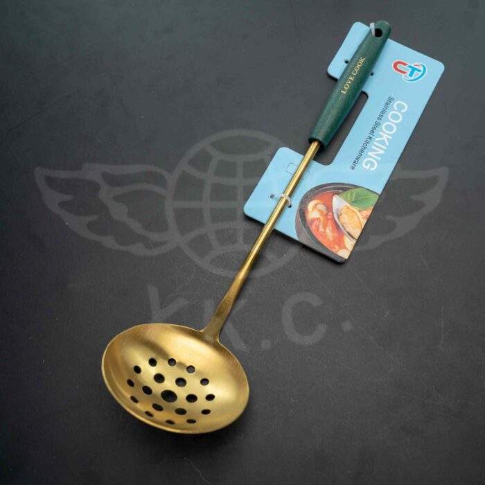 - ผลิตจากสแตนเลสเคลือบสีทอง คุณภาพดี แข็งแรง ทนทาน ต่อการใช้งานบริเวรปากกระบวย ออกแบบให้มีรูโปรง สำหรับตักเนื้อสัตว์ เพื่อแยกออกจากอาหาร ได้สะดวกและง่ายด้ามจับเขียว ช่วยให้จับถนัด กระชับมือ ไม่ร้อน
