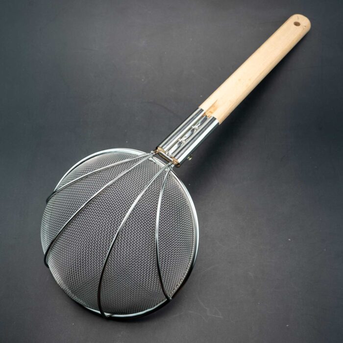 ด้ามจับไม้ จับถนัดมือ ช่วยลดความร้อน ขณะใช้งาน เหมาะสำหรับตักของทอด ลวกผัก หรือ อาหารที่ต้องการระบายน้ำมัน น้ำ แข็งแรง ทนทาน